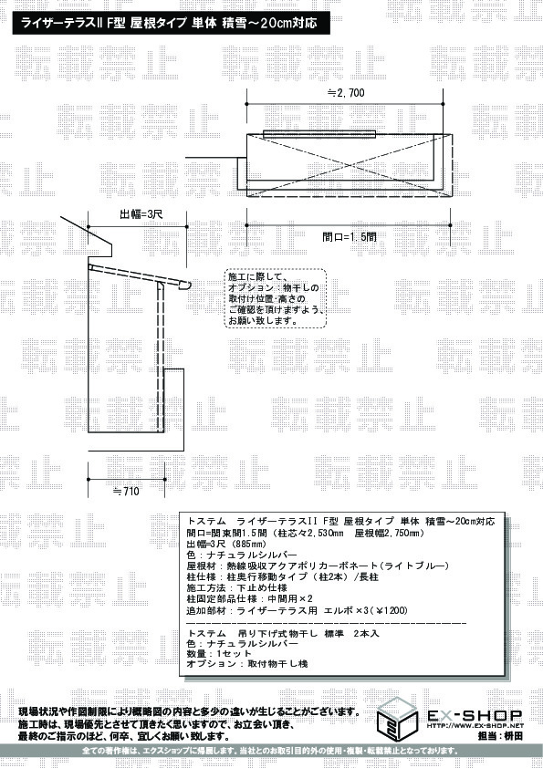 サイズ | 屋根幅 2,750mm 出幅 885mm |