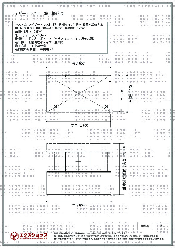 | サイズ | 屋根幅 3,660mm 出幅 1,785mm |