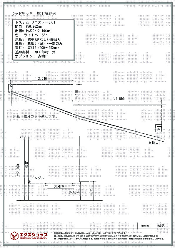 この度は、リコステージII の施工ご依頼を頂き誠に有り難うございます。お客様のお住まいが、より快適に、より素敵になりましたこと、大変嬉しく存じます。優しい日差しが降り注ぐウッドデッキは、ご家族皆様の憩いの場として、永くご愛用頂けるものと存じます。お顔の見えないネット販売ではございますが、今後も、お客様に最大限ご満足頂けるエクスショップを目指し努力して参ります。また機会がございましたら、是非弊社にご用命くださいますよう、宜しくお願い致します。