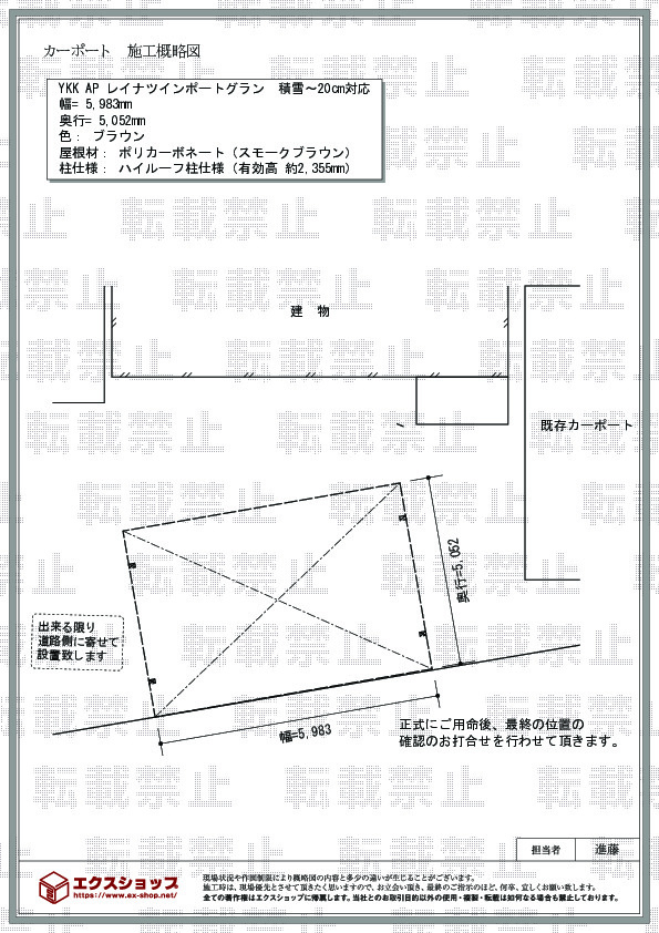 見積をしていただいた中で一番安く、また見積時も丁寧に見てもらい、道路に出てしまうところを調整しないといけないことと、一番自分たちが求めていた幅のものを見積もって頂き安心して購入出来ました。雨に濡れることなく車へ出入りできるので嬉しいです。ありがとうございました。