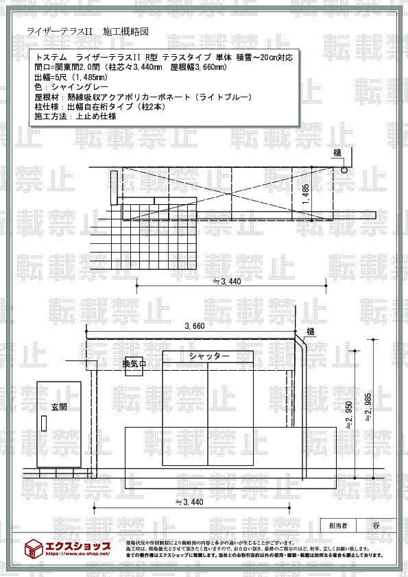 | サイズ | 屋根幅 3,660mm 出幅 1,485mm |