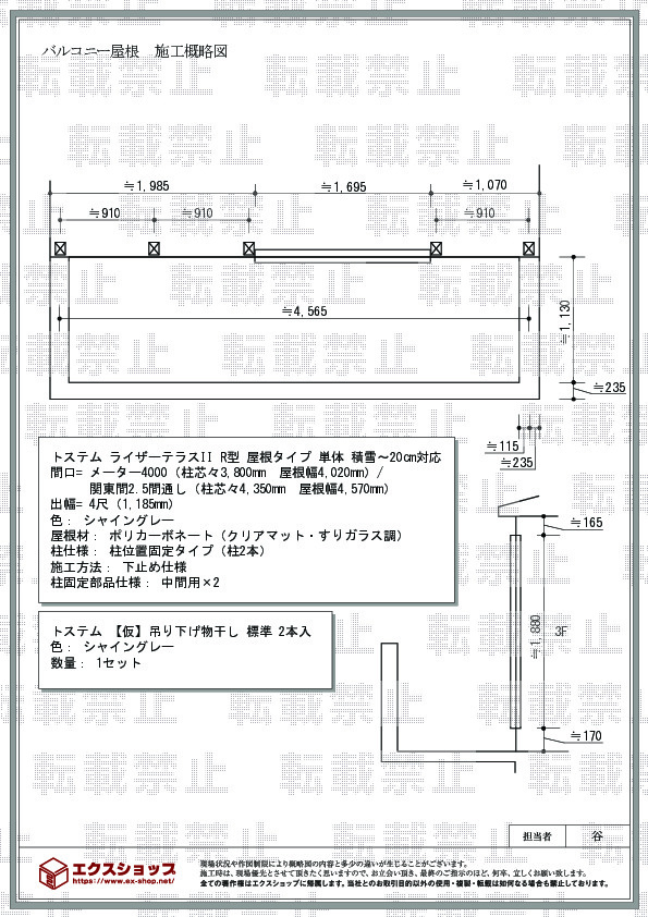サイズ | 屋根幅 4,570mm 出幅 1,185mm |