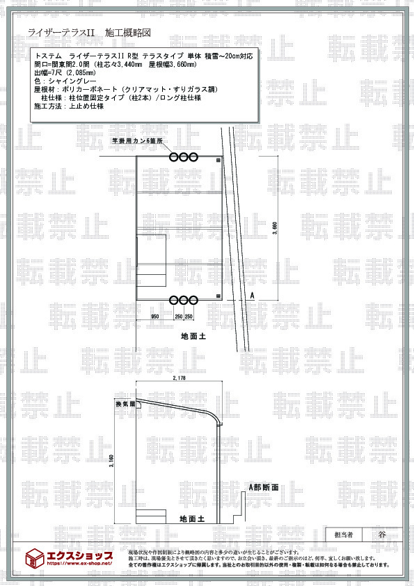 | サイズ | 屋根幅 3,660mm 出幅 2,085mm |