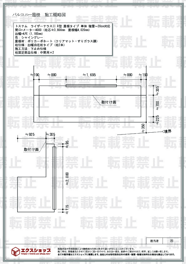 | サイズ | 屋根幅 4,020mm 出幅 1,185mm |
