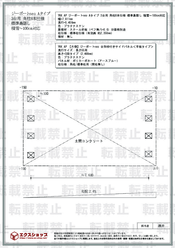 この度は、ジーポートneoの施工をご依頼頂きまして、誠に有り難うございます。顔のみえないネット販売にはご不安がおありだったかと存じますが、弊社を信頼して、施工までお任せ頂いたことを誠に嬉しく存じます。頑丈なスチール折板の屋根を、太い8本の柱で支えておりますので、抜群の安定感があり、頼もしい存在でございますね。これからも、エクスショップをご利用頂いた皆様に笑顔の輪が広がりますよう、なお一層の努力を重ねて参りたいと存じます。またのご利用を、心よりお待ち申し上げております。