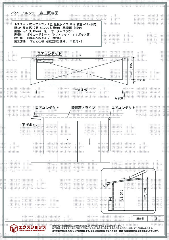 施工を伴います商品を、顔の見えないネットショッピングでご依頼頂くにあたりましては、ご不安に思われることも多かったかと存じますが、弊社を信頼してご用命くださり、誠に有り難うございます。高い耐風圧性能を誇りますパワーアルファ L型が綺麗に納まり、私どもも嬉しく存じます。出幅自在桁タイプでございますので、バルコニーの出幅に合わせて屋根を外に張り出すことが出来、快適にご使用頂けるものと存じます。今後も丁寧で迅速な対応を心掛け、更にお客様に満足して頂けるエクスショップを目指して参ります。またのご利用を、心よりお待ち申し上げております。