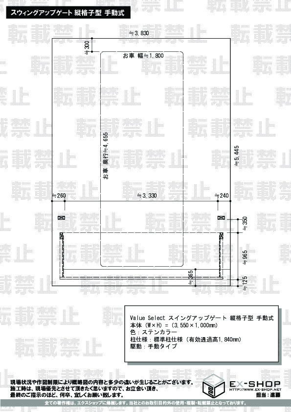 スウィングアップゲート2型 縦パネル 手動式はエクスショップオリジナルブランドの手動タイプの跳ね上げ式カーゲートです。バネの特殊技術により、円滑かつ静かに開閉します。また、扉のロックはつまみが大きいワンタッチ式。本体カラーはステンカラーまたはつや消しブラックから選択いただけます。※道路境界-扉本体間は標準高:364mm、ハイルーフ:426mmを確保ください。