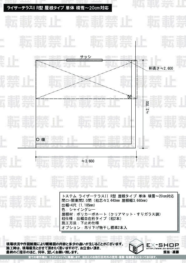 | サイズ | 屋根幅 3,660mm 出幅 1,185mm |