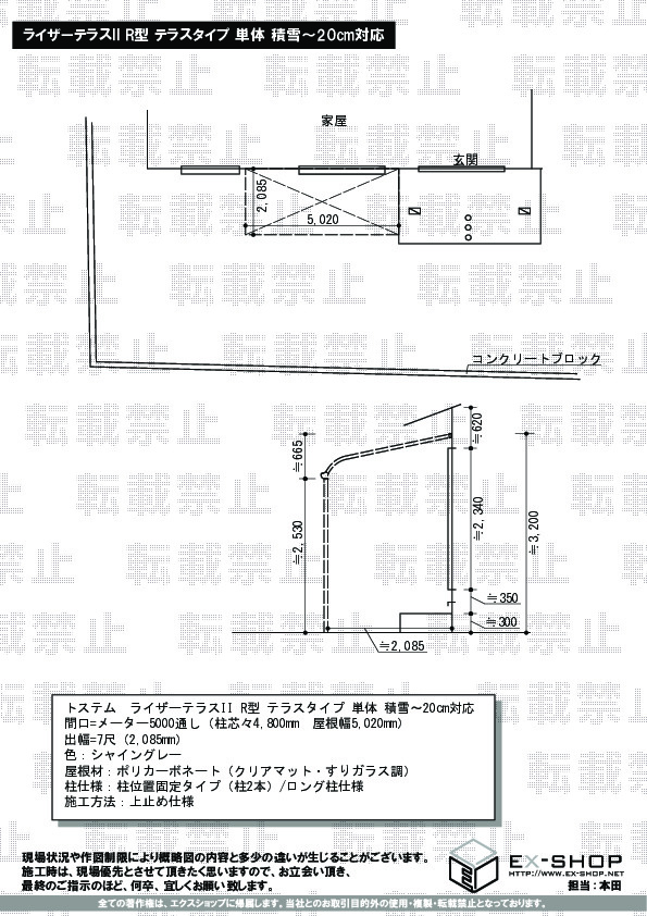 | サイズ | 屋根幅 5,020mm 出幅 2,085mm |