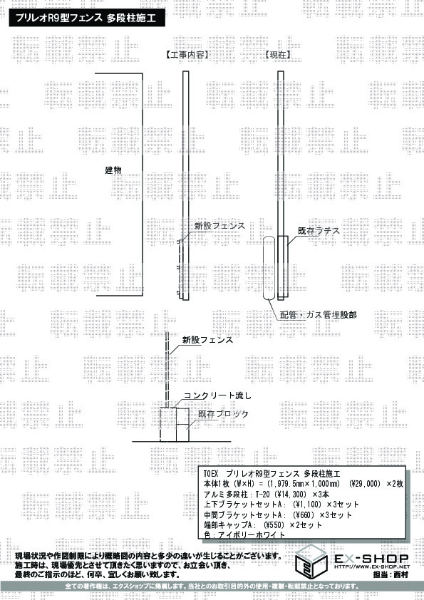 この度は、 プリレオR9型フェンスの施工をご依頼頂きまして、誠に有り難うございます。弊社の対応に至らないところがあり、ご迷惑をお掛けしましたこと、誠に申し訳ございませんでした。今後は、スピードの面でもご期待に応えることが出来ますよう、もっと効率よくお客様にご不便をおかけすることがない方法を開発していくよう、努力してまいります。万が一、何かございましたら、お手数ですが、エクスショップまでご連絡いただけますよう、宜しくお願い致します。