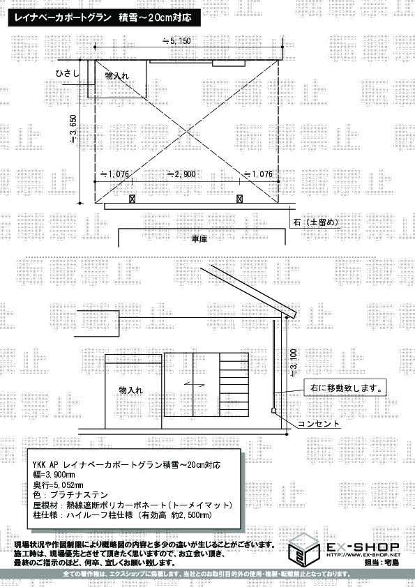 レイナベーカポートグランの施工をご依頼頂きまして、誠に有り難うございます。建物の壁に直接取り付けるタイプの屋根でございますので、デッドスペースが少なく、広々とお使い頂けるものと存じます。今後また、エクステリアの施工をご検討の際には、是非、エクスショップをご利用頂きますよう宜しくお願い致します。この度のご利用、誠に有り難うございました。
