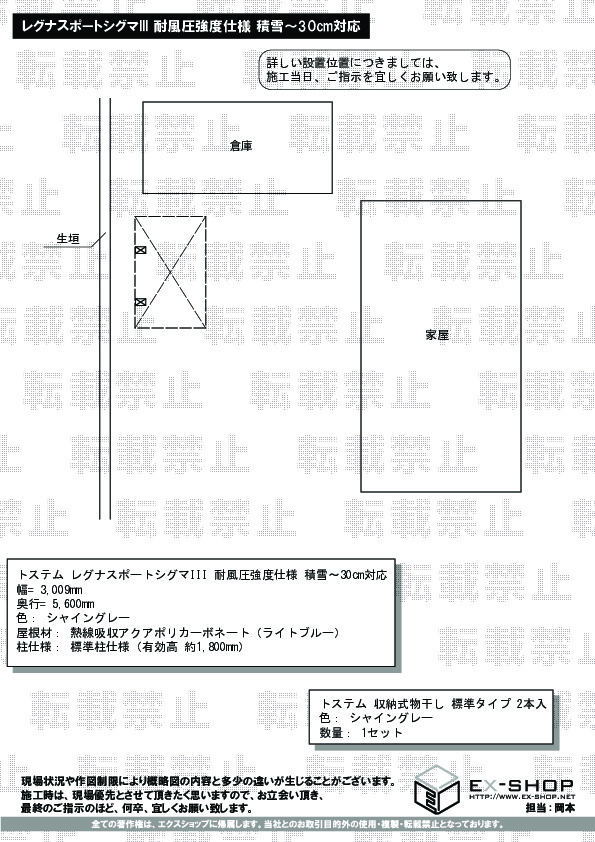 カーポート本体の工事はよくできたと思いますが、既存の倉庫の軒先とカーポートがすれすれにクロスする結果になり、台風などの際、破損しないか心配しています。