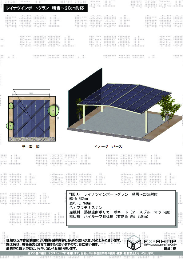 この度はレイナツインポートグランの施工をご依頼頂きまして、誠に有り難うございます。ネット販売という顔の見えないお取引にご不安もおありであったかと存じますが、弊社を信頼して頂き、施工までお任せ頂きまして、大変光栄でございます。プラチナステンのカーポートが周辺の景観を損ねることなく施工されており、洗練された素敵なお仕上がりでございますね。熱線遮断ポリカーボネートの屋根材が夏場には太陽熱を遮断致しますので、休憩所としても快適にご利用頂けることと存じます。今後もお客様のご期待を裏切ることの無いよう、なお一層の努力を重ねて参りますので、また機会がございましたらエクスショップをご用命下さいますよう、宜しくお願い致します。