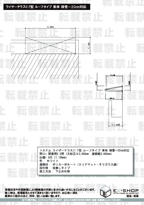 | サイズ | 屋根幅 3,660mm 出幅 1,185mm |
