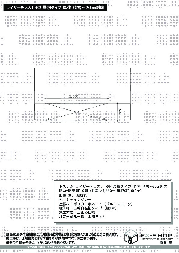 | サイズ | 屋根幅 3,660mm 出幅 885mm |
