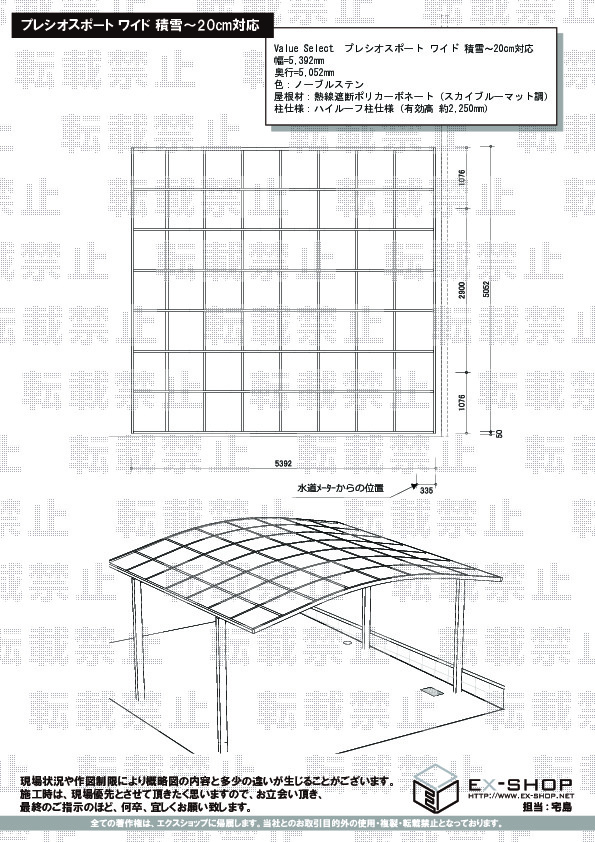 この度はプレシオスポート ワイドの施工をご依頼頂き、誠に有り難うございました。顔の見えないインターネット取引ではございますが、常にお客様を意識し、お客様の立場にたってご説明するよう心がけておりますので、このようなお褒めのお言葉を頂くのは一番の喜びでございます。アーチ状のお屋根がお客様のお車を包み込み、雨や埃からお車をお守りいたします。熱線遮断ポリカーボネート(スカイブルーマット調)の屋根材が紫外線と太陽の熱も遮断致しますので、暑い夏でも快適にお過ごし頂けることと存じます。これからもお客様にさらにご満足頂けるショップを目指し、エクスショップは日々精進して参ります。また機会がございましたら是非弊社にご用命くださいますよう、宜しくお願い致します。