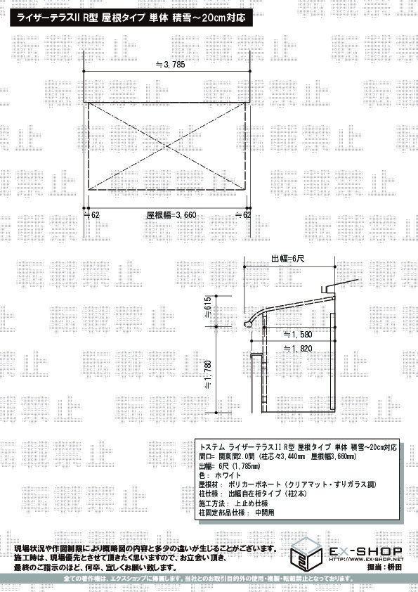 サイズ | 屋根幅 3,660mm 出幅 1,785mm |