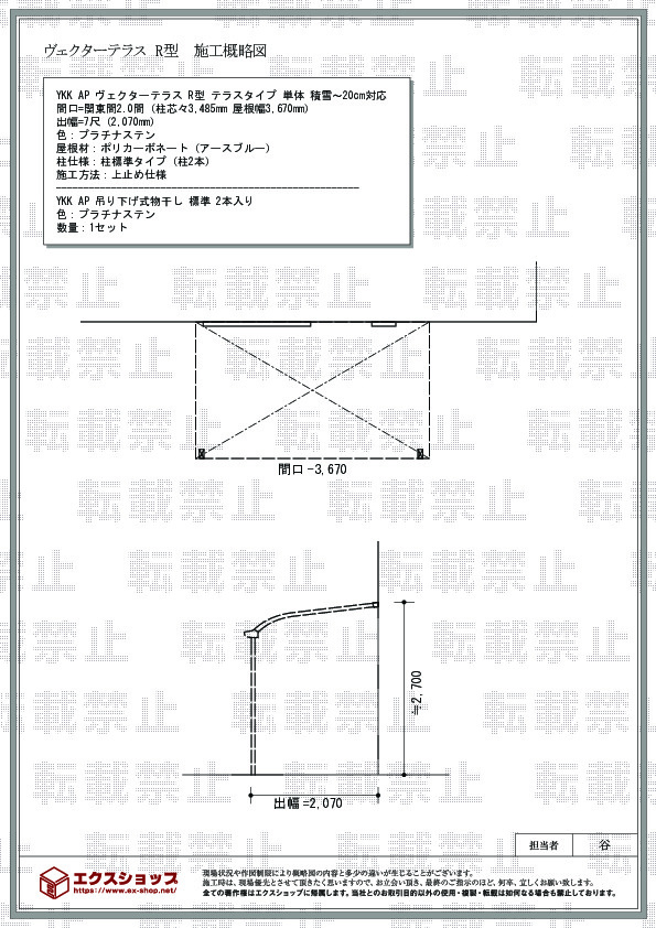 | サイズ | 屋根幅 3,670mm 出幅 2,070mm |