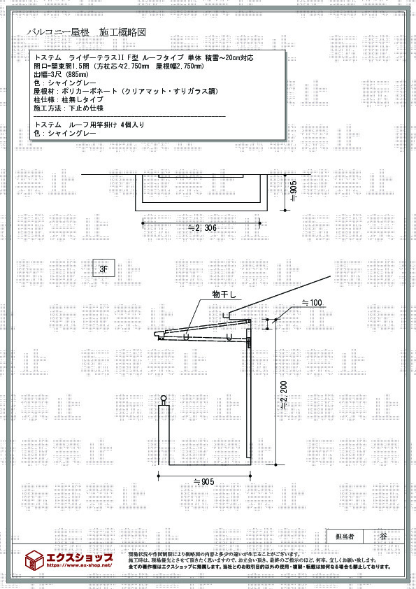 | サイズ | 屋根幅 2,750mm 出幅 885mm |