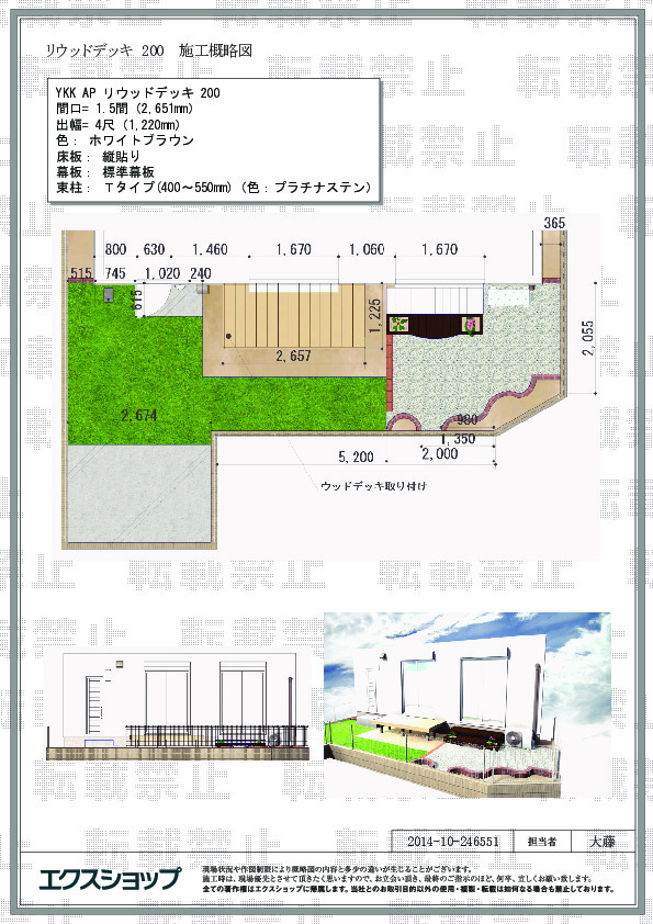 エクスショップをご利用頂きまして、誠に有り難うございます。お客様の大切なお住まいへのエクステリアの施工をお任せ頂き、『満足な仕上がり』とのお言葉を頂くことが、私どもにとりましては何よりの喜びでございます。明るいお色のリウッドデッキ 200が、ホワイトの窓枠や緑の芝生とマッチして、とても美しいお仕上がりでございますね。弊社では、ウッドデッキ以外にも、様々なエクステリア商品を用意してお客様をお待ちしておりますので、また、機会がございましたら、エクスショップにご用命くださいますよう宜しくお願い致します。この度のご利用、誠に有り難うございました。