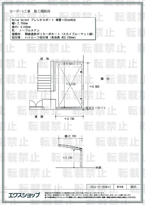 この度はプレシオスポートの施工をご依頼頂き、誠に有り難うございました。再度弊社を信頼してくださり、お選び頂きましたこと、大変嬉しく存じます。熱線遮断ポリカーボネート(スカイブルーマット調)の屋根材を使用したカーポートは、雨や紫外線の他に太陽の熱も遮り、大切なお車をしっかりとお守り致します。今回施工したエクステリアにより、お客様の暮らしがより豊かで快適なものとなりますことを願っております。これからもお客様に更にお喜び頂けるサービスのご提供が出来るよう、エクスショップは日々精進して参ります。また機会がございましたら、是非弊社にご用命くださいますよう、宜しくお願い致します。