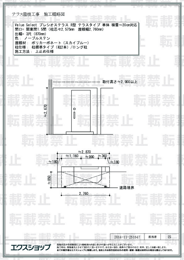 サイズ | 屋根幅 2,760mm 出幅 870mm |