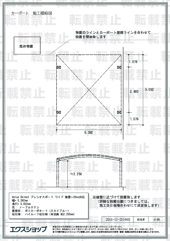 施工を伴います商品を、顔の見えないネットショッピングでご依頼頂くにあたりましては、ご不安に思われることも多かったかと存じますが、弊社を信頼してご用命くださり、誠に有り難うございます。現場調査、ご発注と進むうちに、お客様のご心配を払拭することが出来ましたこと、大変嬉しく存じます。明るいお屋根とハイルーフ柱仕様のプレシオスポート ワイド は、大型のカーポートではございますが、圧迫感の無いお仕上がりでございますね。これからも、エクスショップをご利用頂いた皆様に笑顔の輪が広がりますよう、なお一層の努力を重ねて参りたいと存じます。またのご利用を、心よりお待ち申し上げております。