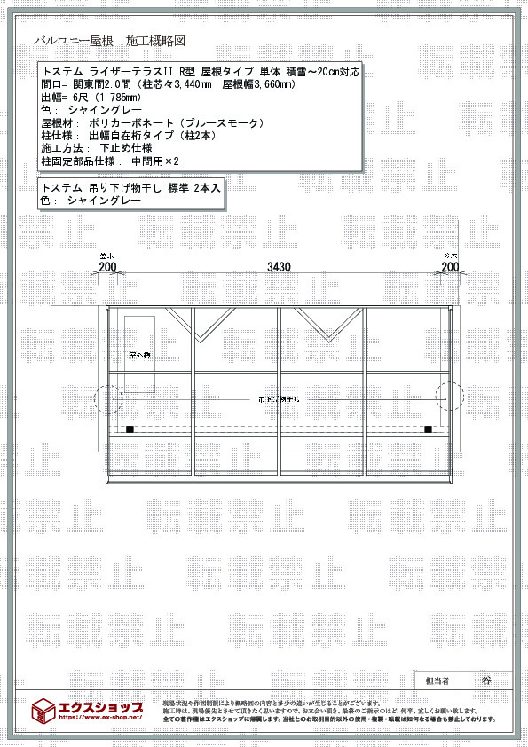 | サイズ | 屋根幅 3,660mm 出幅 1,785mm |