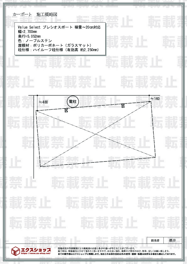昨年購入した車両は高さが2,250mmあり構造的にルーフには乗れず、洗車がとても大変で苦労していました。現在3連のカーポートはありますが高さが2,400mmの所があり納まりません。高さがクリアーできるカーポートを探した所エクスショップに辿り着きました。価格、保証等説明を聞き、クチコミにも後押しされ決めさせて頂きました。現地調査も準則にして頂き設置も近くの業者様により、2日で完了しました。設置後雨が降りましたが、車両が濡れないため雨垂れ等無くとても満足しております。また機会がありましたらその際は是非お願いしたいと思います。大変有り難う御座いました。