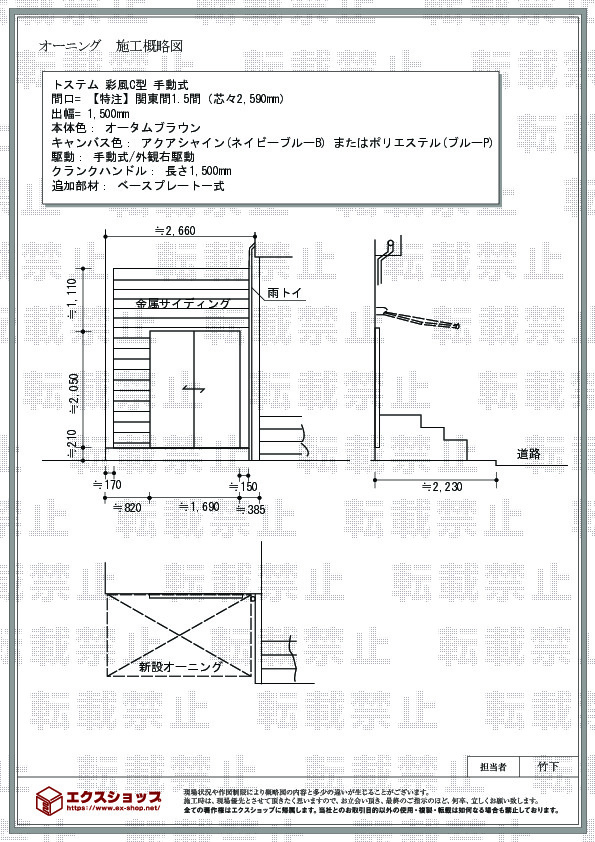 発注をお願いする前の見積もりの段階から担当して下さった方の対応気遣いがとても良く最後まで気持ちの良い買い物をさせて頂きました。施工の方も細かい説明も分かりやすくして頂きとても良かったです。オーニングを自宅用としてでなく店舗用で購入したので今後大いに活用させて頂きます。