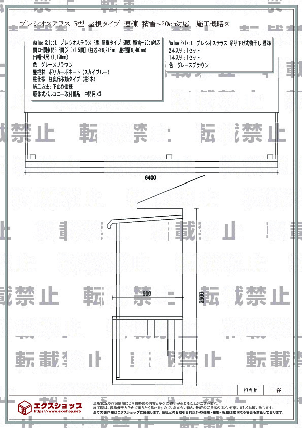 | サイズ | 屋根幅 6,400mm 出幅 1,170mm |