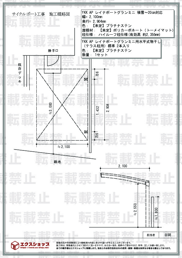 この度は、レイナポートグラン ミニの施工をご依頼頂きまして、誠に有り難うございます。プラチナステンとポリカーボネート(トーメイマット)の組み合わせが、お住まいの雰囲気とマッチして、素敵なお仕上がりでございますね。せっかくご用命くださったにも関らず、ご不安、ご不満をお持ちでいらっしゃるとのこと、誠に申し訳なく存じております。今後は、お客様に100%ご満足頂けますよう、日々努力して参りたいと存じます。万が一、また何かございましたら、お手数ではございますが、エクスショップまでご連絡頂けますよう、宜しくお願い致します。