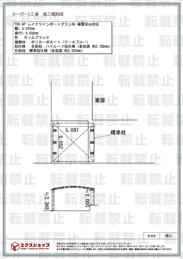 昨年購入した車両は高さが2,250mmあり構造的にルーフには乗れず、洗車がとても大変で苦労していました。現在3連のカーポートはありますが高さが2,400mmの所があり納まりません。高さがクリアーできるカーポートを探した所エクスショップに辿り着きました。価格、保証等説明を聞き、クチコミにも後押しされ決めさせて頂きました。現地調査も準則にして頂き設置も近くの業者様により、2日で完了しました。設置後雨が降りましたが、車両が濡れないため雨垂れ等無くとても満足しております。また機会がありましたらその際は是非お願いしたいと思います。大変有り難う御座いました。