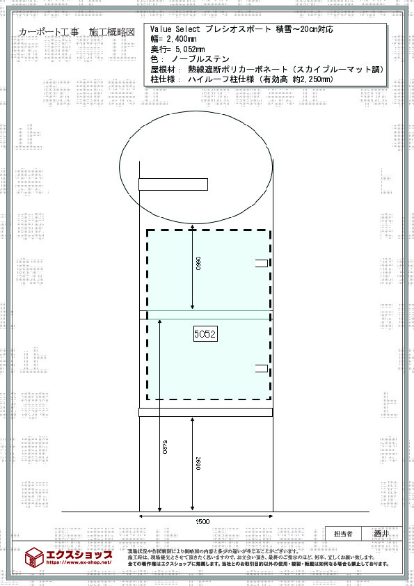 昨年購入した車両は高さが2,250mmあり構造的にルーフには乗れず、洗車がとても大変で苦労していました。現在3連のカーポートはありますが高さが2,400mmの所があり納まりません。高さがクリアーできるカーポートを探した所エクスショップに辿り着きました。価格、保証等説明を聞き、クチコミにも後押しされ決めさせて頂きました。現地調査も準則にして頂き設置も近くの業者様により、2日で完了しました。設置後雨が降りましたが、車両が濡れないため雨垂れ等無くとても満足しております。また機会がありましたらその際は是非お願いしたいと思います。大変有り難う御座いました。
