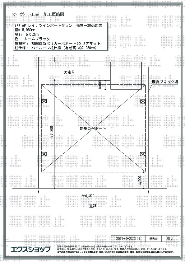 昨年購入した車両は高さが2,250mmあり構造的にルーフには乗れず、洗車がとても大変で苦労していました。現在3連のカーポートはありますが高さが2,400mmの所があり納まりません。高さがクリアーできるカーポートを探した所エクスショップに辿り着きました。価格、保証等説明を聞き、クチコミにも後押しされ決めさせて頂きました。現地調査も準則にして頂き設置も近くの業者様により、2日で完了しました。設置後雨が降りましたが、車両が濡れないため雨垂れ等無くとても満足しております。また機会がありましたらその際は是非お願いしたいと思います。大変有り難う御座いました。