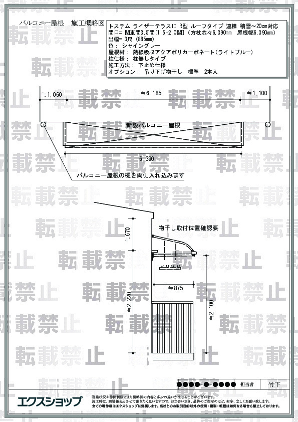 サイズ | 屋根幅 6,390mm 出幅 885mm |