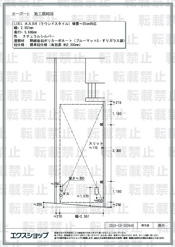 昨年購入した車両は高さが2,250mmあり構造的にルーフには乗れず、洗車がとても大変で苦労していました。現在3連のカーポートはありますが高さが2,400mmの所があり納まりません。高さがクリアーできるカーポートを探した所エクスショップに辿り着きました。価格、保証等説明を聞き、クチコミにも後押しされ決めさせて頂きました。現地調査も準則にして頂き設置も近くの業者様により、2日で完了しました。設置後雨が降りましたが、車両が濡れないため雨垂れ等無くとても満足しております。また機会がありましたらその際は是非お願いしたいと思います。大変有り難う御座いました。