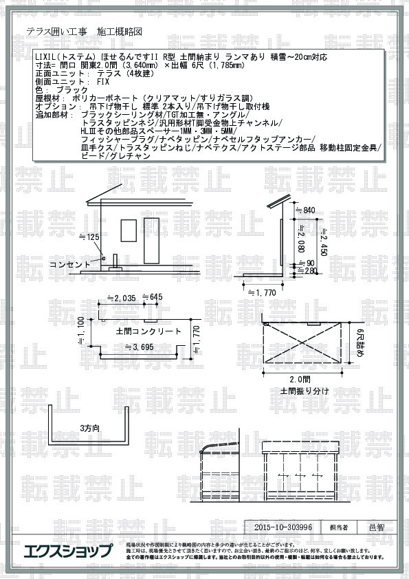 ほせるんですII R型の施工のご依頼を頂きまして、誠に有り難うございます。ポリカーボネート(クリアマット/すりガラス調)で覆われたテラス囲いはとても明るく美しいお仕上がりでございますね。雨や紫外線をしっかりと遮りますが、柔らかい光が入りますので、日差しの強い日も、悪天候の日にも気兼ねなくお洗濯物を干して頂けるものと存じます。今後もお客様の快適な住まい作りのお手伝いが出来るよう、スタッフ一同尽力して参りますので、また機会がございましたら、是非エクスショップにご用命頂きますよう、宜しくお願い申し上げます。