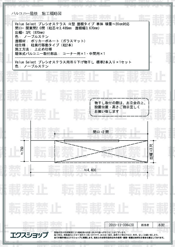 この度はプレシオステラス R型 屋根タイプの施工のご依頼を頂きまして、誠に有り難うございます。ノーブルステンのお色のバルコニー屋根がお住まいのサッシ等のお色とマッチし、後付けとは感じられない美しいお仕上がりでございますね。ポリカーボネート(ガラスマット)の屋根が紫外線を遮り、雨の日でも気兼ねなくお洗濯物を干して頂けるものと存じます。プレシオステラスは弊社オリジナルではございますが、品質には一流メーカーには引けを取らないものと存じておりますので、お気に召して頂き、永くご愛用頂けますと幸いでございます。今後もお客様にご満足頂ける施工が出来るよう、日々精進して参りますので、また機会がございましたら、是非エクスショップにご用命頂きますよう、宜しくお願い申し上げます。