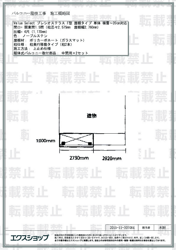 プレシオステラス F型の施工をご依頼頂きまして、誠に有り難うございます。バルコニーの幅より、出幅を大きくとれます柱奥行移動タイプですので、雨の吹き込みもしっかり防げるものと存じます。ポリカーボネート(ガラスマット)の屋根材は光を通し、お部屋の明るさはそのままでございますね。これからも、お客様の暮らしがより快適になりますよう、エクステリアの施工を通してお手伝いして参りたいと存じます。また機会がございましたら、是非エクスショップにご用命頂きますよう、宜しくお願い致します。