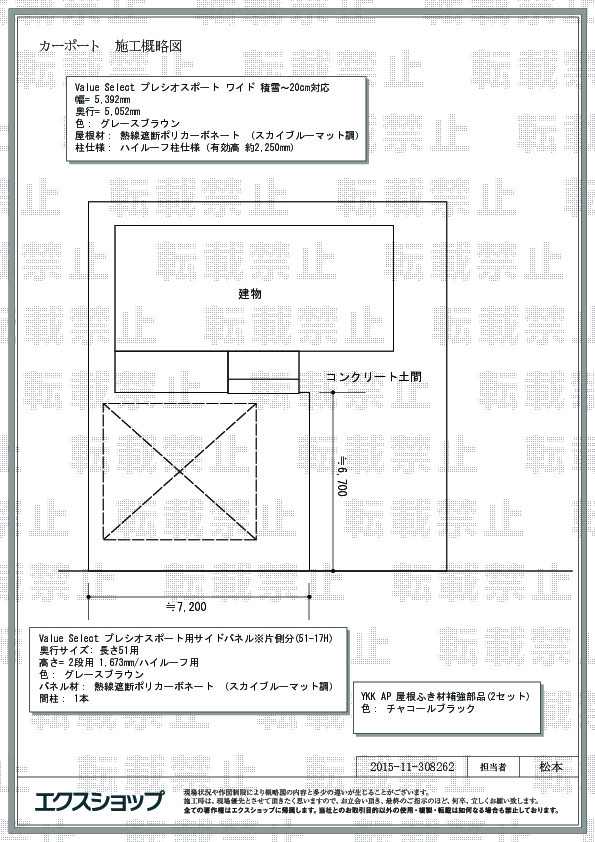 プレシオスポート ワイドの施工のご依頼を頂きまして、誠に有り難うございます。シックなグレースブラウンのお色のカーポートが周りの景観を損ねる事なく、スペースに収まりました事、喜ばしく存じます。熱線遮断ポリカーボネート (スカイブルーマット調)の屋根がお車を汚れや傷みから守り、冬場はガラスの凍結を防ぎ、夏場は車内の温度上昇を和らげますので、季節を問わず快適にお使い頂けるものと存じます。また道路側に面したサイドパネルを設けられた事で、目隠し効果にもなり、ご家族皆様のプライバシーを守るものと存じます。これからも全ての対応においてお客様にご満足頂けるよう、スタッフ一同努力して参りますので、また機会がございましたら、是非エクスショップにご用命頂きますよう、宜しくお願い申し上げます。