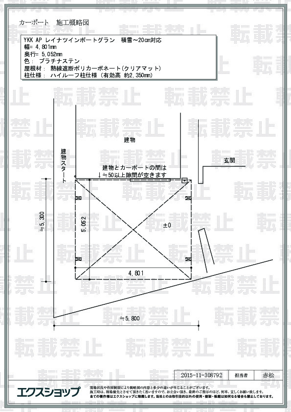 レイナツインポートグランの施工のご依頼を頂きまして、誠に有り難うございます。お店の手前にシンプルなカーポートが自然に馴染み、圧迫感のない明るいお仕上がりでございますね。熱線遮断ポリカーボネート(クリアマット)の屋根が雨や雪・紫外線を遮り、夏場の強い日差しを和らげますので、季節を問わず快適にお使い頂けるものと存じます。大雪が降る前に完工し、カーポートで雪の影響を最小限に出来ました事、誠に喜ばしく存じます。これからも常にお客様目線で、お客様のご要望に適った施工が出来るよう、スタッフ一同努力して参りますので、また機会がございましたら、是非エクスショップにご用命頂きますよう、宜しくお願い申し上げます。