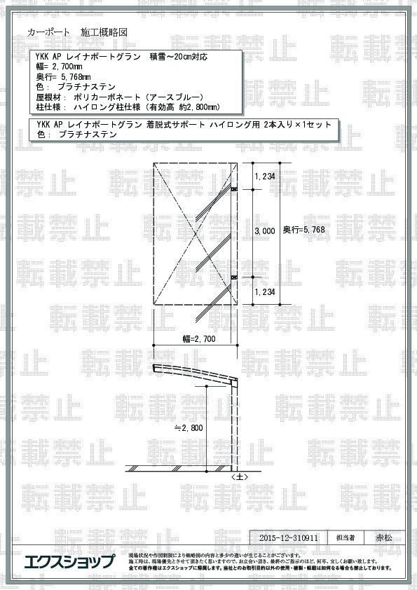 昨年購入した車両は高さが2,250mmあり構造的にルーフには乗れず、洗車がとても大変で苦労していました。現在3連のカーポートはありますが高さが2,400mmの所があり納まりません。高さがクリアーできるカーポートを探した所エクスショップに辿り着きました。価格、保証等説明を聞き、クチコミにも後押しされ決めさせて頂きました。現地調査も準則にして頂き設置も近くの業者様により、2日で完了しました。設置後雨が降りましたが、車両が濡れないため雨垂れ等無くとても満足しております。また機会がありましたらその際は是非お願いしたいと思います。大変有り難う御座いました。