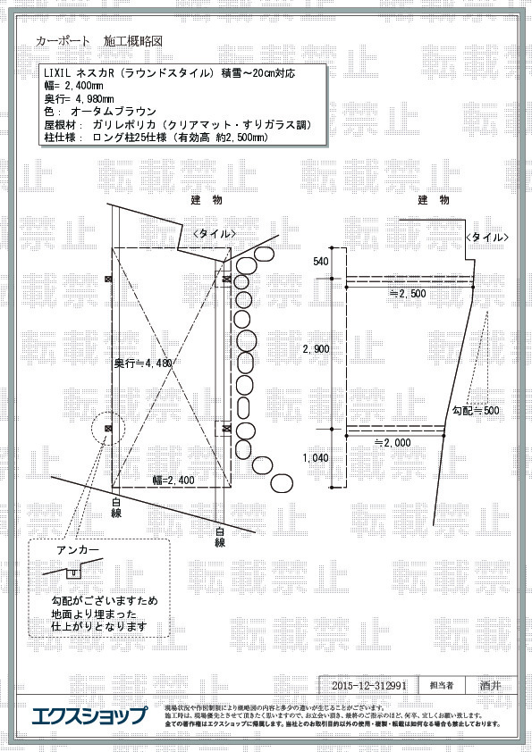 ネスカR (ラウンドスタイル) の施工のご依頼を頂きまして、誠に有り難うございます。シンプルなデザインのカーポートが周りの景観に馴染み、自然な収まり具合でございますね。傾斜地での設置ではございますが、お車をしっかりと覆い、ガリレポリカ(クリアマット・すりガラス調)の屋根がお車を汚れや傷みから守るものと存じます。弊社の営業担当につきまして、対応が至らず、申し訳ございませんでした。今後は提携施工店とに密な連携を強め、細やかな対応を心掛けて参りますので、また機会がございましたら、是非エクスショップにご用命頂きますよう、宜しくお願い申し上げます。