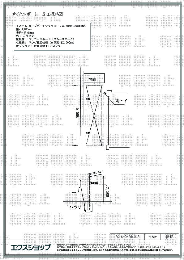 | 屋根材等 | ポリカーボネート(ブルースモーク) 柱仕様:ロング柱23仕様(有効高 約2,300mm) |