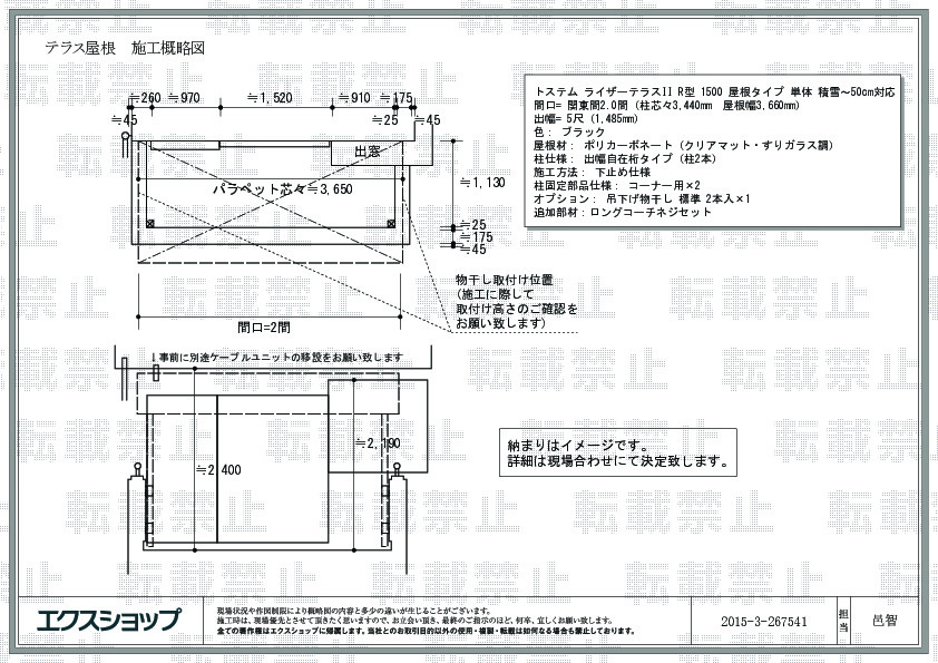| サイズ | 屋根幅 3,660mm 出幅 1,485mm |