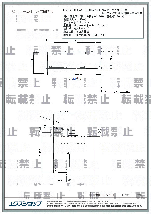 | サイズ | 屋根幅 3,660mm 出幅 1,185mm |