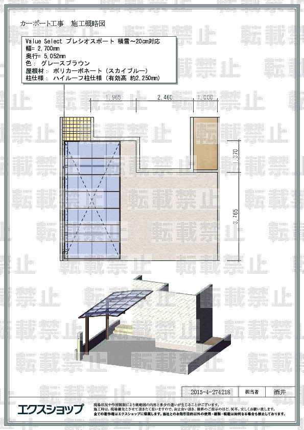 この度はプレシオスポート の施工を儀御ライザーテラス頂き、誠に有り難うございました。数多くございますショップの中からエクスショップをお選び頂きましたこと、大変光栄に存じます。片側支柱のカーポートはデッドスペースの少ないすっきりとしたお仕上がりでございますね。お車の出し入れもしやすく、快適にご使用頂けるものと存じます。お顔の見えないネット販売ではございますが、今後も、お客様に最大限ご満足頂けるエクスショップを目指し努力して参ります。また機会がございましたら、是非弊社にご用命くださいますよう、宜しくお願い致します。