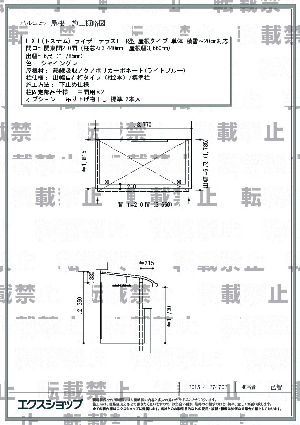 | サイズ | 屋根幅 3,660mm 出幅 1,785mm |