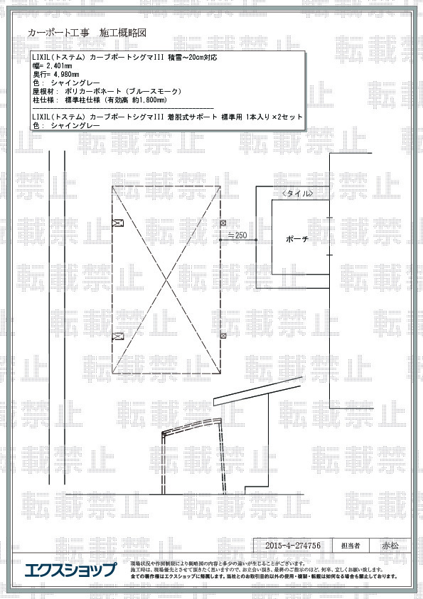 昨年購入した車両は高さが2,250mmあり構造的にルーフには乗れず、洗車がとても大変で苦労していました。現在3連のカーポートはありますが高さが2,400mmの所があり納まりません。高さがクリアーできるカーポートを探した所エクスショップに辿り着きました。価格、保証等説明を聞き、クチコミにも後押しされ決めさせて頂きました。現地調査も準則にして頂き設置も近くの業者様により、2日で完了しました。設置後雨が降りましたが、車両が濡れないため雨垂れ等無くとても満足しております。また機会がありましたらその際は是非お願いしたいと思います。大変有り難う御座いました。